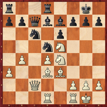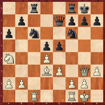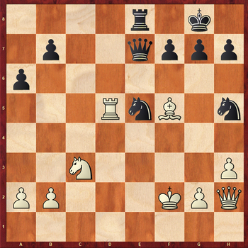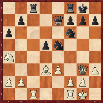 17.Ng5? Тяжелая ошибка в критической позиции. Необходимо было точно посчитать варианты. К перевесу белых вело: