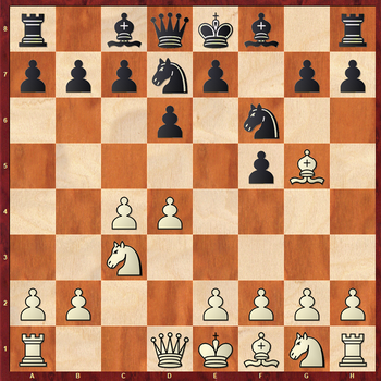 7.Bxf6 Nxf6 8.0–0–0 Bg7 9.Nh3 Be6?! Попытка сразу решить проблему с белопольным слоном, переводя его f7. Логичнее 9...0–0 и в случае прямолинейного 10.Nf4 очень сильно выглядит 10...e5! 11.Nxg6 (11.dxe5 Ng4) 11...Ng4 с перевесом.